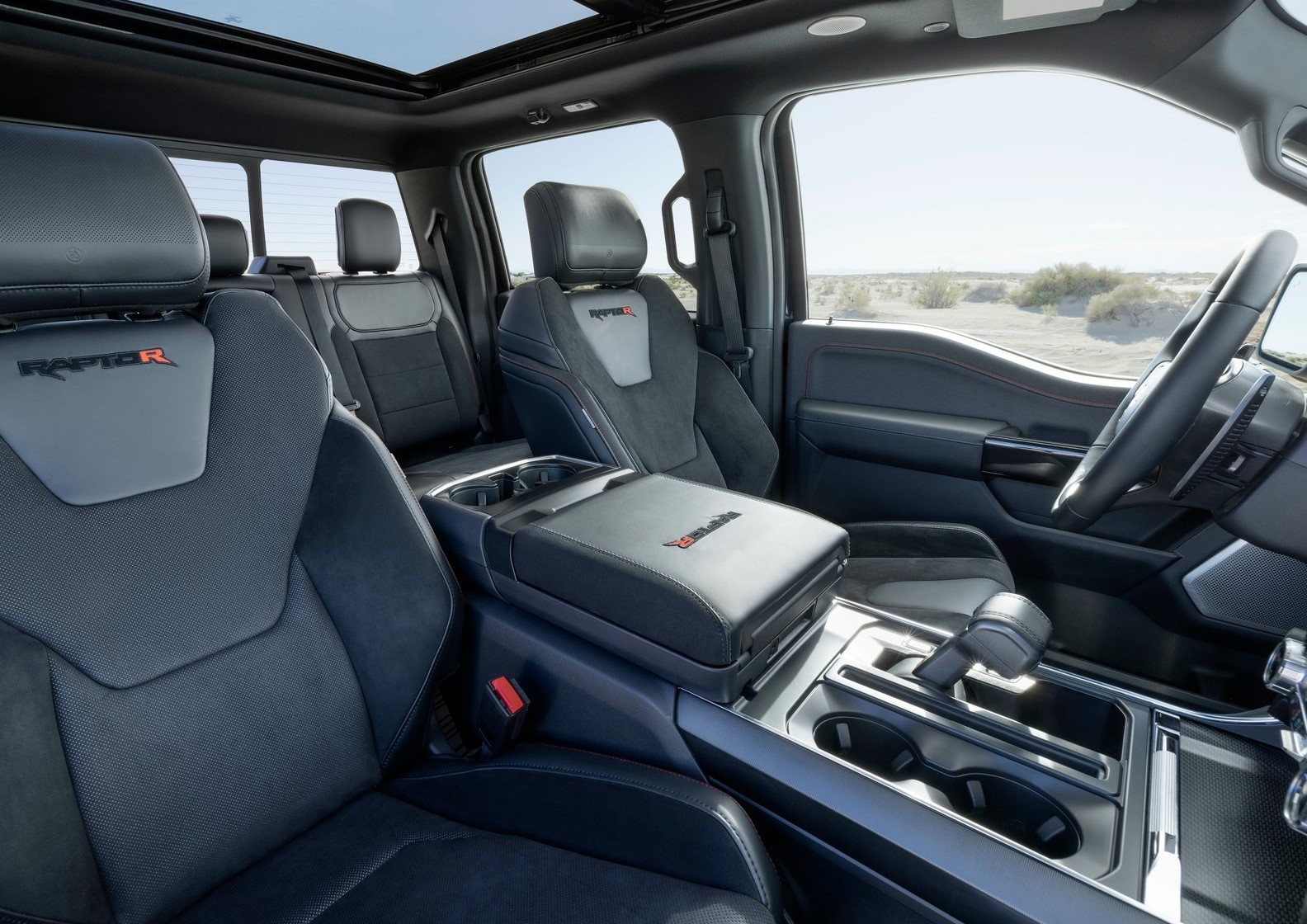 Basada en la cabina doble de la F-150, hay mucho espacio para los pasajeros en cualquier lugar de la Raptor R. El espacio de almacenamiento también es generoso, con múltiples compartimentos para objetos pequeños, varios portavasos, dos guanteras y un gran compartimento bajo el reposabrazos central.
