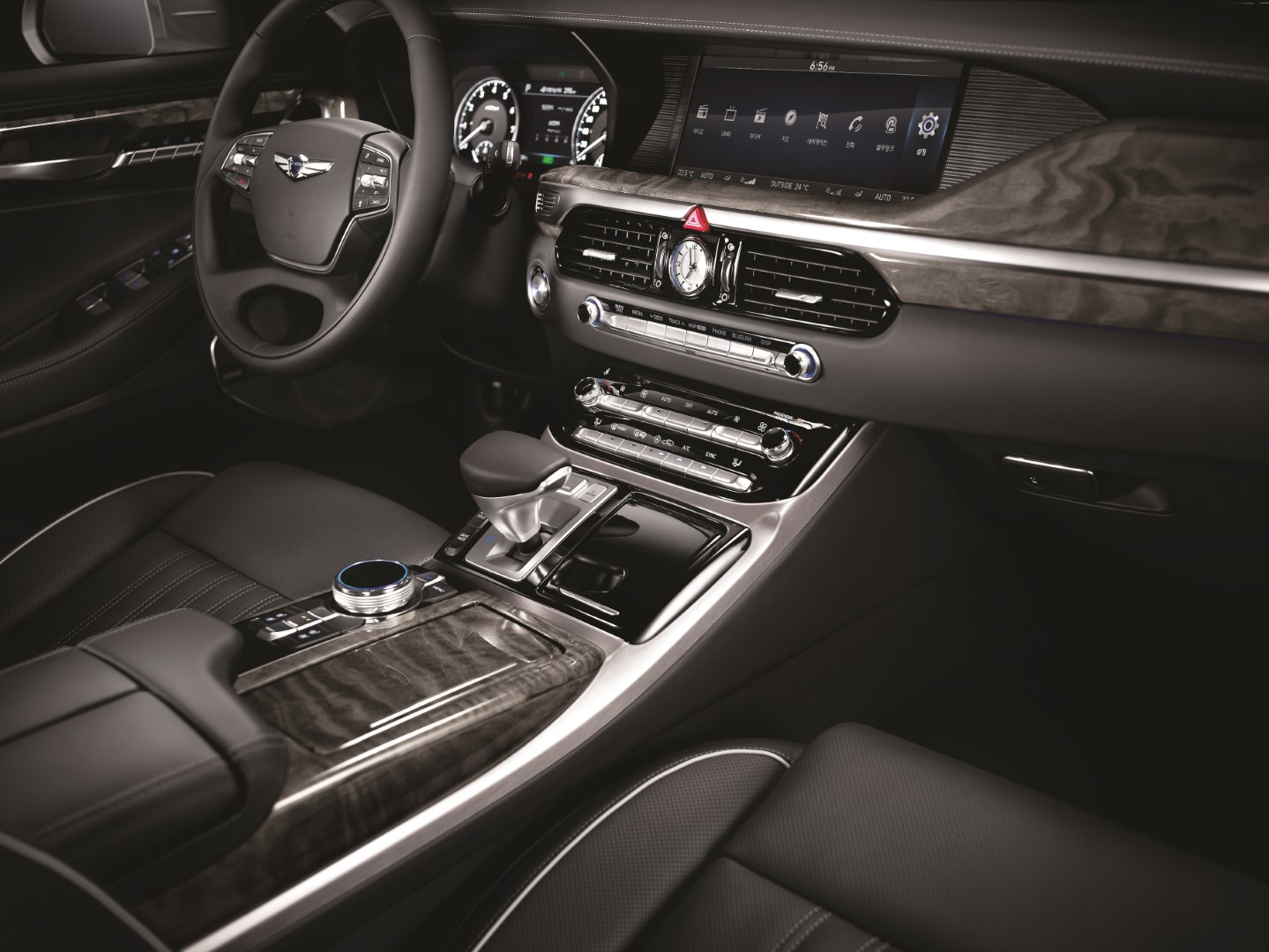 Restando estas lamentables omisiones, el G90 es uno de los vehículos más avanzados tecnológicamente que hayamos probado. Quienes piensen que pueden perder prestaciones tecnológicas eligiendo este Genesis sobre contrapartes europeas, están en un error. Aquí están presentes todos los embrollos tecnológicos actuales, incluyendo controles táctiles en el volante, suficientes botones táctiles, incluyendo los de masaje en los asientos, como para no distraerse buscando opciones escondidas, y dos grandes pantallas de 12.3 pulgadas que nos introducen a un buen entramado de configuraciones y ayudas al conductor, nada difíciles de navegar.